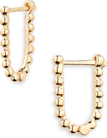 An elongated silhouette modernizes 14-karat-gold hoop earrings crafted from polished beads.