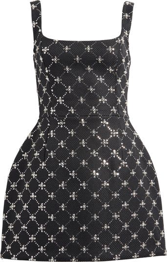 Catch the light and admiring glances in this sculptural tulip minidress. Cut from textured crepe embellished with sequins and beading in a diamond formation, it features corset boning and functional side pockets.