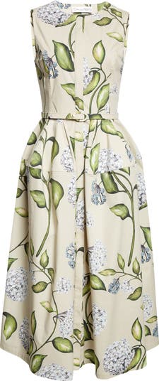 Porcelain Flowers Belted Stretch Cotton Poplin Shirtdress