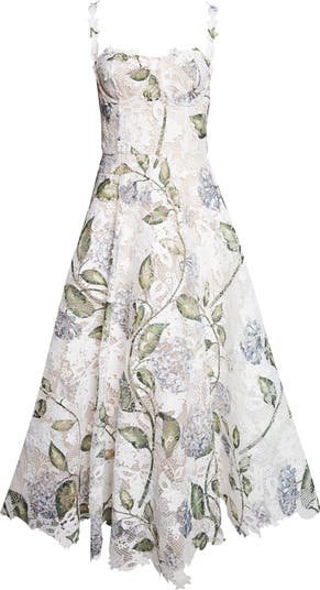 Co-creative directors Laura Kim and Fernando Garcia celebrate the revitalized spirit of a new season with this fabulously flared gown. Clusters of porcelain flowers—reminiscent of those grown in Kim’s family garden—gracefully wind across a canvas of elegant guipure lace, while a structured bodice and gliding silk lining perfect this Italian-crafted style.