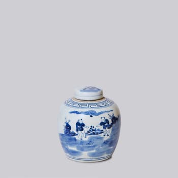 Cobalt Guild offers an assortment of blue and white porcelain vessels from the antiques markets of Jingdezhen, a town long distinguished by imperial patronage. This piece measures 6 1/2” x 7” and depicts happy children at play.