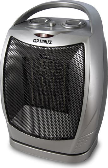 This Optimus Portable Oscillating Ceramic Heater with Thermostat helps you keep your living space warm and cozy. It features a modern mesh grille ceramic heater and has two heat settings for 750 W and 1,500 W. This electric ceramic heater also has safety and protection settings and space-saving housing. An overheat protection circuit and tip-over safety switch helps prevent mishaps and gives you peace of mind. Its compact design makes it easy to take from room to room. Item Dimensions: 8.25" x 6.20" x 11.50" Item Weight: 4.05lbs