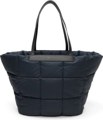 This nylon puffer tote reimagines the classic basket bag with its longline, tapered silhouette and bold quilted texture, making a striking style statement. Tapered shoulder straps ensure comfortable carrying, while the durable, water-resistant material turns this modern tote into a reliable, long-lasting companion.