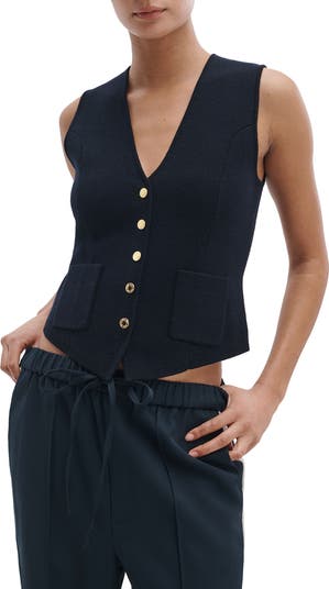 Made from light, breathable wool, this vest keeps the look crisp without feeling heavy. Button it up for a sleek moment or wear it open for easy layering, those gleaming goldtone buttons always doing the most in the best way.