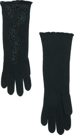 Cashmere gloves with scalloped edges and fancy embroidery with cut out on top
