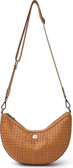 Laser-cut perforations highlight the crescent-shaped profile of a leather shoulder bag featuring an optional webbing crossbody strap for versatile styling.