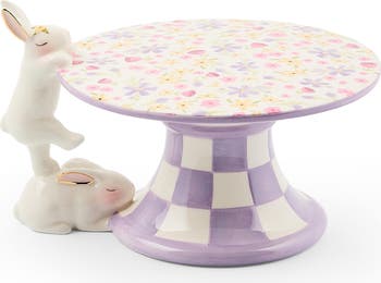 Serve your delicious sweet treats on this ceramic platter featuring Violet Checks, a floral pattern and two sweet bunnies climbing up the platter base.