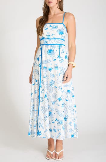 Sun-soaked and easy, this midi sundress features a print that evokes a Mediterranean escape. Contrast piping adds crisp definition, while a smocked back and adjustable straps ensure a flexible fit.