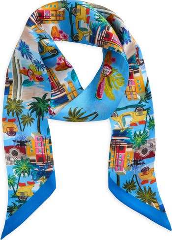 The vibrant scenery from Positano creates a cosmopolitan attitude on this drapey ribbon scarf cut from pure and luxurious silk.