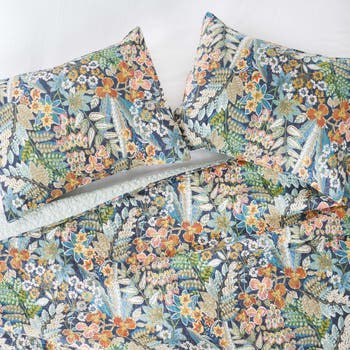 Quilted in a charming array of artistically depicted flowers, this set blooms against a rich indigo backdrop, evoking a picturesque meadow. Radiant dandelion yellow, modern melon orange, and succulent green harmonize with the complementary hues in this print to imbue a timeless allure, perfect for year-round adornment. Flip it over to reveal a soothing soft green ditsy botanical print, offering even more styling possibilities.