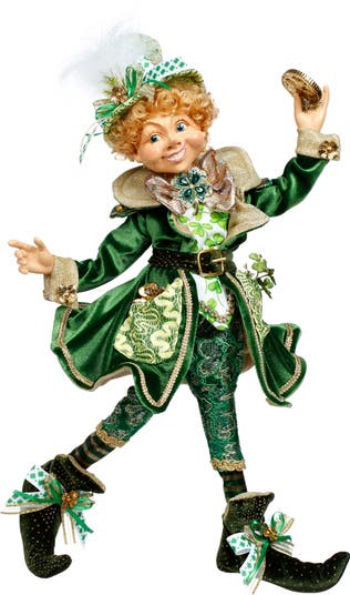 A charming 18.5-inch Mark Roberts Pot of Gold Elfin, this collectible figure exudes whimsical St. Patrick’s Day flair. The elfin is dressed in finely detailed attire, wearing a classic top hat and proudly holding a gold coin that symbolizes luck and prosperity. Crafted with Mark Roberts’ signature artistry and rich fabrics, it makes a standout addition to any seasonal or collectible display.