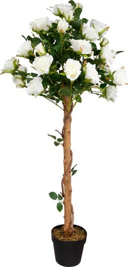 Show off a charming floral accent with this green and white rose potted artificial tree. The tree showcases green foliage and white rose blooms, offering a lasting presentation of natural beauty without the need for watering or sunlight. Nestled in a neutral pot, the artificial tree complements various décor styles, adding a fresh note to any room. Display the potted rose tree in living rooms, sunrooms, or covered patios to create a refreshing and inviting ambiance. The realistic design mimics the appearance of a live rose tree in bloom, providing year-round visual appeal. Durable artificial materials ensure lasting enjoyment, offering a consistently beautiful floral arrangment. The combination of white blossoms and green leaves creates a stylish and eye-catching decorative element. This artificial rose tree offers a lasting and elegant botanical presentation. The maintenance-free design allows for enduring beauty and a classic floral charm. Feature this faux rose tree in your home for a lasting and stylish decoration. Product Features: Buds to fully blossomed roses Comes in weighted black pot Pot is filled with green and brown moss Recommended for indoor use or outdoor covered use Dimensions: 4' high x 22" diameter Material(s): plastic/fabric/wood/moss