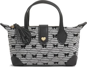 Velvet bow appliqués and a classic houndstooth pattern bring vintage-inspired charm to a scaled-down crossbody bag suspended from an adjustable strap for convenient wear.