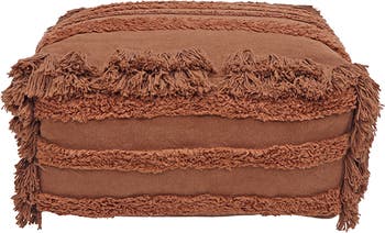 Textured Pouf with a canvas base and rows of contrasting textures. Available in Natural, Olive & Brown, Soil Brown & Dark Olive, and Toffee & Chestnut color combinations. The cover is removable with a zipper, and the inside cushion is filled with small polystyrene beads for comfortable seating.