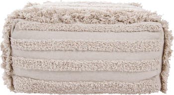 Textured Pouf with a canvas base and rows of contrasting textures. Available in Natural, Olive & Brown, Soil Brown & Dark Olive, and Toffee & Chestnut color combinations. The cover is removable with a zipper, and the inside cushion is filled with small polystyrene beads for comfortable seating.