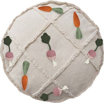 Round pouf in natural color with natural short fringes on top forming a checks pattern. The pouf has a pocket on each side, each containing 4 handmade veggies which can be used play tic tac toe on top of the pouf. The pouf has a zipper at bottom with a removable filler filled with polystyrene pearls.