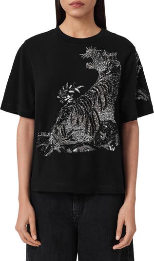 A sequined tiger sparkles and roars from the front of this roomy cotton-jersey T-shirt.
