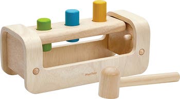 Kids can use the included hammer to pound the pegs until they lay flat on the surface with this wooden playset.
