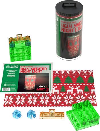 POWER BLOX BYO: HOLIDAY NIGHT LIGHT - UGLY SWEATER 2 - This kit provides a comforting color changing night light with Ugly Sweater glowing patterns. The Power Blox Build Your Own Glowing Holiday Night Light set will gently lull you to sleep with a color-changing LED the gradually displays all colors of the visible light spectrum. Includes filter insert sheet and you can also create your own patterns for really cool effects! Glowing Inserts: Create your own glowing inserts to personalize the night light further. Ideal for showcasing in bedrooms to enjoy the mesmerizing color changes at night. Color Changing LED Night Light: Enjoy a comforting night light with a color-changing LED that gradually cycles through all colors of the visible light spectrum, creating a soothing ambiance for bedtime. Requires one 9V battery (not included). INCLUDES: battery module, LED, 2 conductive blox, space insert.