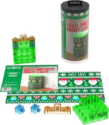 POWER BLOX BYO: HOLIDAY NIGHT LIGHT - UGLY SWEATER 1 - This kit provides a comforting color changing night light with Ugly Sweater glowing patterns. The Power Blox Build Your Own Holiday Night Light set will gently lull you to sleep with a color-changing LED the gradually displays all colors of the visible light spectrum. Includes filter insert sheet and you can also create your own patterns for really cool effects! Glowing Inserts: Create your own glowing inserts to personalize the night light further. Ideal for showcasing in bedrooms to enjoy the mesmerizing color changes at night. Color Changing LED Night Light: Enjoy a comforting night light with a color-changing LED that gradually cycles through all colors of the visible light spectrum, creating a soothing ambiance for bedtime. Requires one 9V battery (not included). INCLUDES: battery module, LED, 2 conductive blox, space insert.