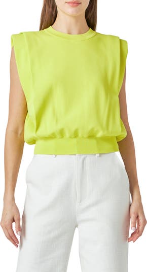 Padded shoulders lend plenty of drama to a sleeveless top completed by a ribbed waist.