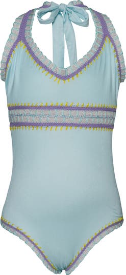 Vibrant trim and whipstitching lend kid-approved style to this one-piece swimsuit that's topped with a halter neck.