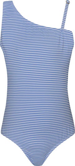 Sailor-themed stripes pattern an asymmetric one-piece swimsuit perfect for your child's next beach day.