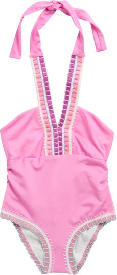 Rainbow-hued trim and whipstitching lend kid-approved style to this two-piece swimsuit ready to make a splash.