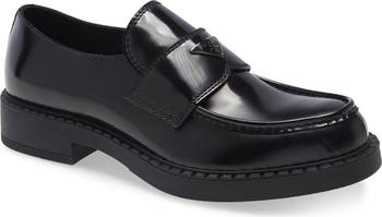 Prada's iconic triangular logo shines on a brushed-leather loafer tastefully updated with a ridged sole resembling tiny chocolate bars.