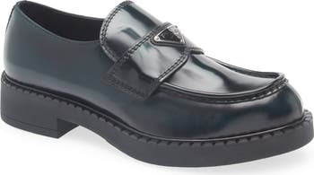 Prada's iconic triangular logo shines at the keeper strap of a leather loafer set on a chunky sole with a textured welt that resembles tiny chocolate bars.