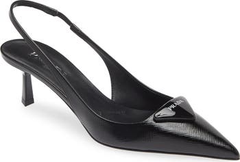 A pointy toe and sculptural kitten heel frame this slingback pump crafted of patent calfskin and finished with a puffy take on Prada's iconic triangle logo.