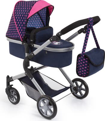 BAYER DESIGN DOLLS: PRAM NEO CITY - BLUE & PINK - City Neo is a modern combi doll's pram with a lovely blue and pink design and suitable for dolls up to 20 inches (52 cm). This sleek and versatile pram is the perfect companion for your child's imaginative play adventures. Thanks to its adjustable handle (ranging from 23" to 31"), City Neo adapts effortlessly to your child's height, ensuring comfort and ease of use. The Carry Case can face either direction - whether your child prefers the carry case to face forward or towards them, the City Neo offers flexibility to suit their preferences. But that's not all – with attached snaps, this doll's pram transforms into a jogger pushchair, adding excitement and variety to playtime activities. Plus, the case's cover provides essential protection from the sun and wind, ensuring your little one's doll stays cozy and safe, whether sitting or lying down. Maneuverability is key, and City Neo delivers with pivoted front wheels that guarantee stable cornering, allowing for smooth navigation through any play environment. And when it's time to hit the road, City Neo can be easily folded for hassle-free transportation and storage. But wait, there's more! The accompanying changing bag is a practical addition, offering ample space to store all the necessary doll equipment, ensuring your little doll mom is prepared for any adventure that comes their way. With City Neo by their side, your child's playtime will be filled with endless fun and creativity.