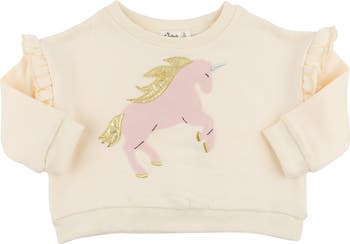 Slouch style sweatshirt featuring ruffle details down the front sides and a pink and gold unicorn applique.; Designed in Minnesota. Available in infant, toddler and girls sizes.