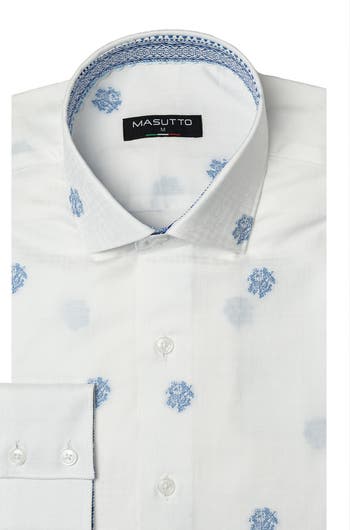 A jacquard grid adds subtle dimension to a woven-cotton sport shirt cut for a modern shape-fit that looks good tucked or untucked.