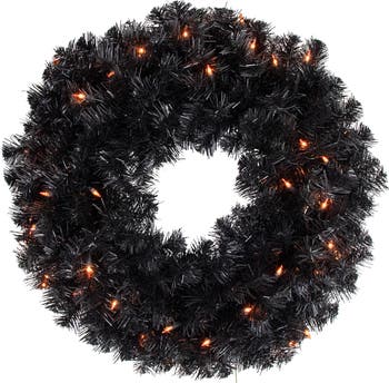 This black Noble Spruce artificial wreath features thick, black tips to create a full, luxurious look. The needles have a matte finish and when coupled with the orange lights make this wreath perfect for adding some frightful fun to your Halloween display this year. Trim with ornaments, leaves, twigs, or spooky accents for some added seasonal fun. Product features: Pre-lit with 50 orange lights Bulb size: mini Bulb type: incandescent 200 tips 2" wide tips 34" black lead cord No assembly required – wreath comes in 1 piece Includes a heavy-duty ring metal frame backing for hanging Additional product features: Light sets on the wreath are UL certified and approved for indoor or outdoor use, however, the wreath itself is recommended for indoor use If one bulb burns out, the rest will stay lit Lights are equipped with Lamp Lock feature, which makes them replaceable, interchangeable and keep them from falling out Contains 1 plug with end connector which allows you to stack multiple lighted items together (not to exceed 210 watts) Comes with replacement bulbs and spare fuse Wire gauge: 22 120 volts, 60 hertz, .17 amps, 20.4 watts Dimensions: 24" diameter (measured from outermost tip to outermost tip across the wreath) Material(s): PVC/metal/glass bulbs/wire Note: Branches are compressed for shipment, and need to be fluffed out upon arrival to look like the photo