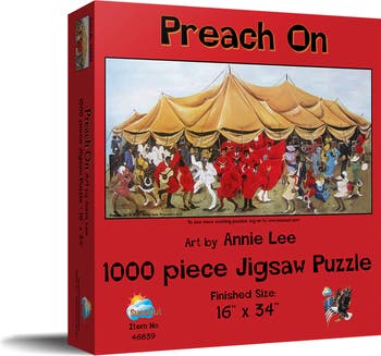 Step into the vibrantly hued world of artist Annie Lee with the SunsOut 1000 Piece Jigsaw Puzzle, creatively titled "Preach On." This masterpiece vividly portrays Americana religion, transmuting your puzzling experience into a joyful and vibrant venture. When completed, this 16" x 34" puzzle forms a perfect way to unwind and resonate with the soulful energy of Lee's work, alongside the soothing rhythm of assembling each unique piece. It's evident in every piece's interlocking precision and durability, crafted from high-quality recycled cardboard, that SunsOut Puzzles adheres to the highest standards of excellence. As a proudly woman-owned small business based in the USA, SunsOut Puzzles stand behind their products with a worry-free guarantee and responsive customer service. Embracing sustainability, these puzzles utilize eco-friendly, soy-based inks and top-notch recycled-board. Annie Lee's "Preach On" doesn't just complete your puzzle collection but enriches it with a splash of culture, creativity, and the vivid essence of American religion. Whether it's for yourself or a gift to a loved one, this puzzle represents a thoughtful choice for adults who value art and are stimulated by the challenge of an intricate puzzle. Share the delight of piecing together and unveiling a masterpiece from one of America’s treasured artists with this exquisite SunsOut jigsaw puzzle.