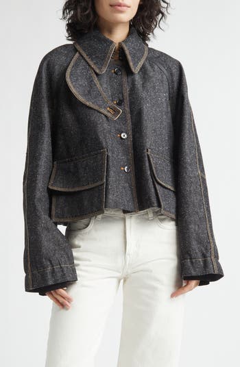 Baggy, hand-draped cargo pockets, elbow patches and removable throat latch bring a utilitarian look to this cropped denim jacket finished with sartorial three-row stitching.