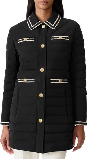 This straight-fit long coat made with a stretchy, lightweight shell for ease of movement is warmed with lightweight recycled down. Two-tone embroidery down the collar, cuffs and pockets give it an elevated finish.