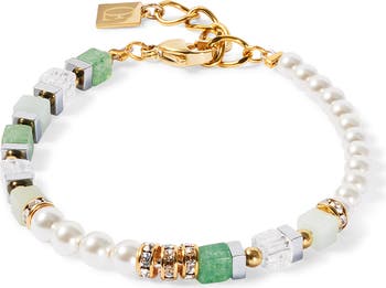 Naturally beautiful, playfully elegant - the Precious Fusion Offset bracelet gold-green combines the vibrant green tones of amazonite, green aventurine and rock crystal with the softly shimmering white Crystal Pearls by Swarovski. Golden stainless steel details in gold lend the bracelet a sophisticated touch, while the refined offset design creates a modern, lightweight look. A perfect companion for stylish looks with a touch of nature.