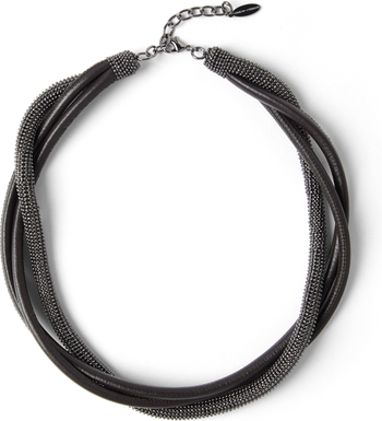 The necklace features tubular strips of leather paired with shiny monili, the iconic element of the Brunello Cucinelli collections. Fine rows of beads, crafted with a faceted cut to emphasize shiny reflections, make up the monili. All metal parts are coated with precious materials that completely replace Nickel, enriching the excellence of every single detail.