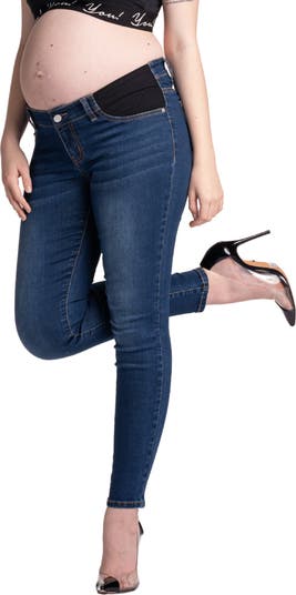 Stretchy waistband panels comfortably accommodate your growing bump in these skinnies made with SILHOUTEX™ technology that shapes and flatters changing curves.
