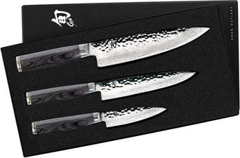 Begin your cutlery collection with the Shun Premier Grey 3-Piece Starter Set. It comes in a convenient storage box and includes the Shun Premier Grey 4-inch Paring Knife, 6.5-inch Utility Knife, and 8-inch Chef's Knife. The paring knife is an essential tool to handle smaller cutting tasks, such as peeling, coring, and pitting. The blade tapers to a sharp, pointed tip. The utility knife has a narrow, straight blade and a sharp tip to handle detail work, along with slicing and chopping. The chef's knife is an all-purpose knife that can mince herbs, dice vegetables, and slice through thick rinds and large cuts of meat.The high performance Damascus-clad blades are made from a VG-MAX steel core with 34 layers of steel on each side. The wavy pattern is formed as the blades are ground and bead-blasted from the spine to the razor-sharp edge, hand-sharpened to a 16-degree cutting angle. The blades are hand-hammered to create its distinctive look. The tsuchime finish results in hollow-ground cavities on the blade surface, which reduce drag and release food from the blade while cutting. VG-MAX stainless steel is proprietary to Shun. It includes a higher percentage of carbon for greater strength and durability. This alloy combines multiple other metals, including chromium, cobalt, vanadium, molybdenum and tungsten, to further improve wear resistance, corrosion resistance, and strength. Shun Premier Grey knife blades are stronger, more durable, and stay sharper longer. The stylish grey PakkaWood handles are contoured to fit comfortably in your hand and finished with an embossed end cap. Resin is added to genuine hardwood to create moisture-resistant, strong, and durable PakkaWood.The Shun Premier Grey collection features a hand-hammered tsuchime finish that evokes the traditional look of ancient Japanese knives and swords. Each knife in the Shun Premier Grey collection boasts all of the essential features that make Shun a top choice of professional chefs.* What's in the box: 4-inch paring knife, 6.5-inch utility knife, and 8-inch chef's knife* Damascus-clad VG-MAX steel blades for strength and durability* Hand-sharpened 16-degree cutting angle for a razor-sharp edge* Hand-hammered tsuchime finish for distinctive look, reduced drag, and easy release of food while cutting* Full-tang construction offers balance and strength* Grey PakkaWood handles, contoured for comfortable fit and finished with embossed end cap* Hand wash and dry immediately after use* Made in Japan