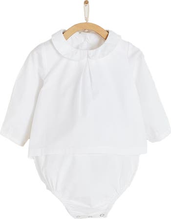 This Fresh And Beautiful Blouse Has A Peter Pan Polo Collar And Long Sleeves. It Has An Attached Bodysuit With Snaps For Easy Changes And Three Back Buttons, Perfect For Special Occasions.