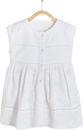 This beautiful girls' dress is made from soft, embroidered cotton fabric and lined with smooth white cotton. The dress features a centered front pocket with buttons for easy access, adding a classic and relaxed touch to the design. Delicate lace trim adorns the hem and sleeves, matching the white tone of the fabric. The intricate embroidery and soft fabric make this dress perfect for special occasions, ensuring your little one looks and feels her best.