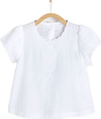 This adorable white cotton blouse features intricate embroidery throughout the center of the garment in a matching tone-on-tone thread. The relaxed fit silhouette gives off a casual, laid-back vibe, making it perfect for special occasions. Delicate white embroidery adorns the cap sleeves, adding a touch of sweetness to this charming blouse.