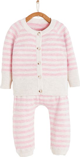 Cotton knitted set. A classic and elegant ensemble for the baby's first days. It features a braided knit style and button line, adding unique details to the set. The classic pants maintain the same knit style as the sweater.