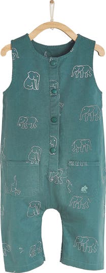 This sleeveless and footless playsuit features a vibrant green color with a fun white elephant print. Practical details include two front pockets, buttons from the neckline to the waist, and snap closures in the crotch area for easy diaper changes. A comfortable and stylish choice for your little one!
