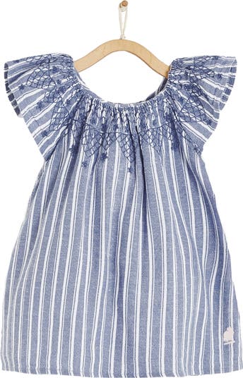 This adorable striped dress for baby girls features a beautiful smocking detail in matching blue thread. The dress has wide, puffy sleeves that allow for a full range of motion, making it perfect for active babies. A centered back opening with buttons makes for easy changes, while the matching diaper cover completes the look. Made from soft, breathable fabric, this dress provides comfort and freshness for daily activities.