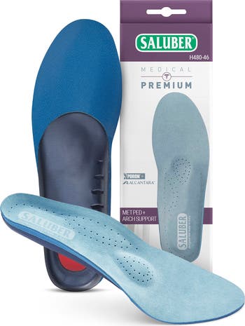 A soft Alcantara© top cover and shock-absorbing PORON® cushioning bring breathable comfort to this supportive full-length insole designed with targeted arch and metatarsal support.