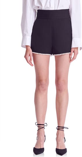 Luminous imitation-pearl beads orbit midnight-black shorts fashioned with a tapered high waist and convenient side pockets.